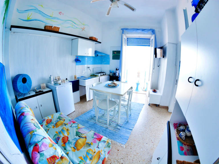 Questo grazioso appartamento per vacanze e' al primo piano, ed e' composto da una camera da letto matrimoniale con un piccolo bagno, un soggiorno con angolo cottura completo di stoviglie ed un balconcino vista mare, dove sarà bellissimo ammirare i meravigliosi tramonti. E' dotato, inoltre, di un divano letto ad una piazza e mezza dove possono dormire uno o due bambini.